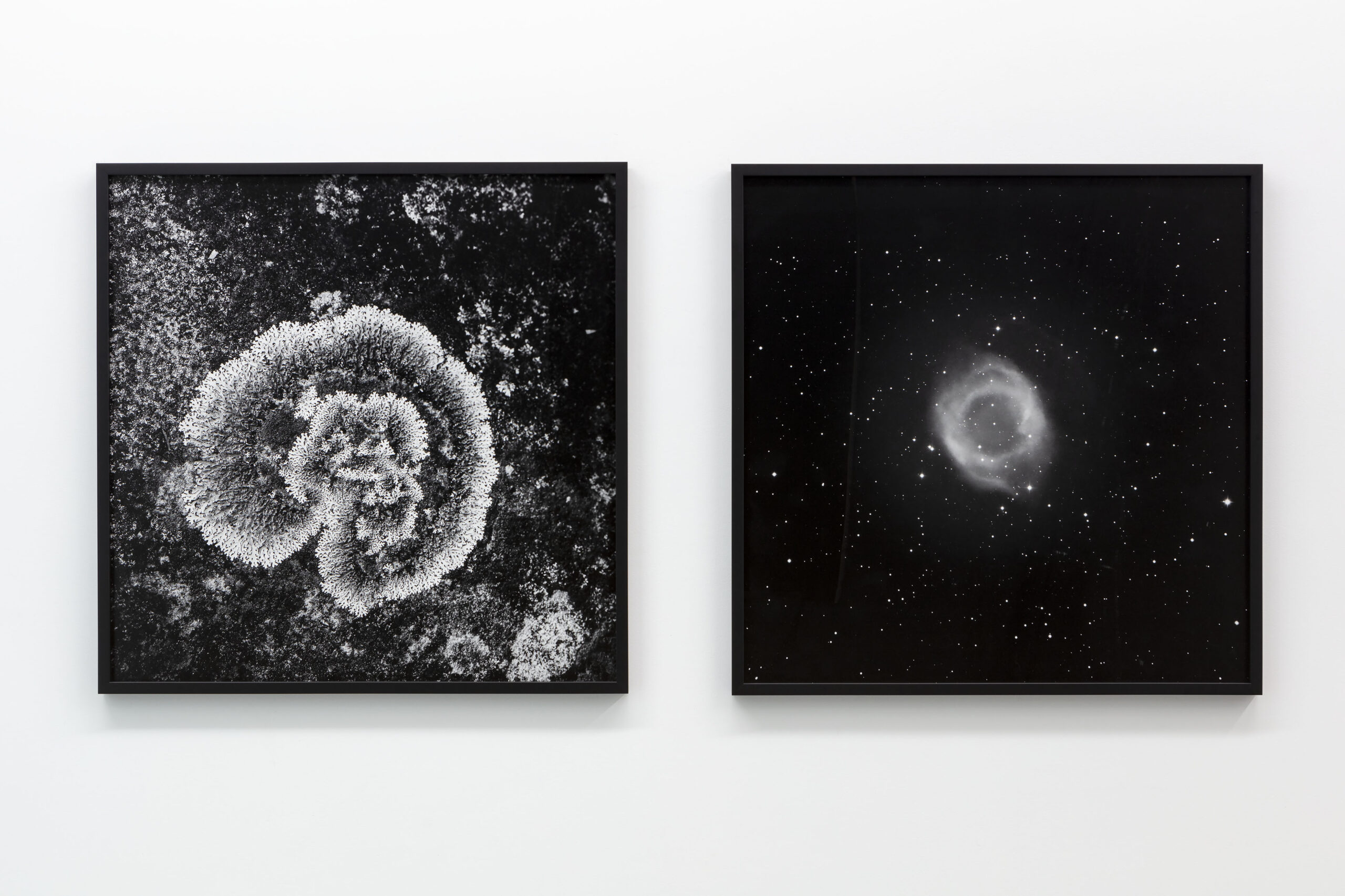 David Haines and Joyce Hinterding, Lichen and Stars 3 (Kings Tableland / NGC7293 Helix Nebula), 2021, pigment print on Ilford Gold Fibre Pearl 290gsm, 2 units, each 93 x 93cm (framed). Photograph Ashley Barber.
