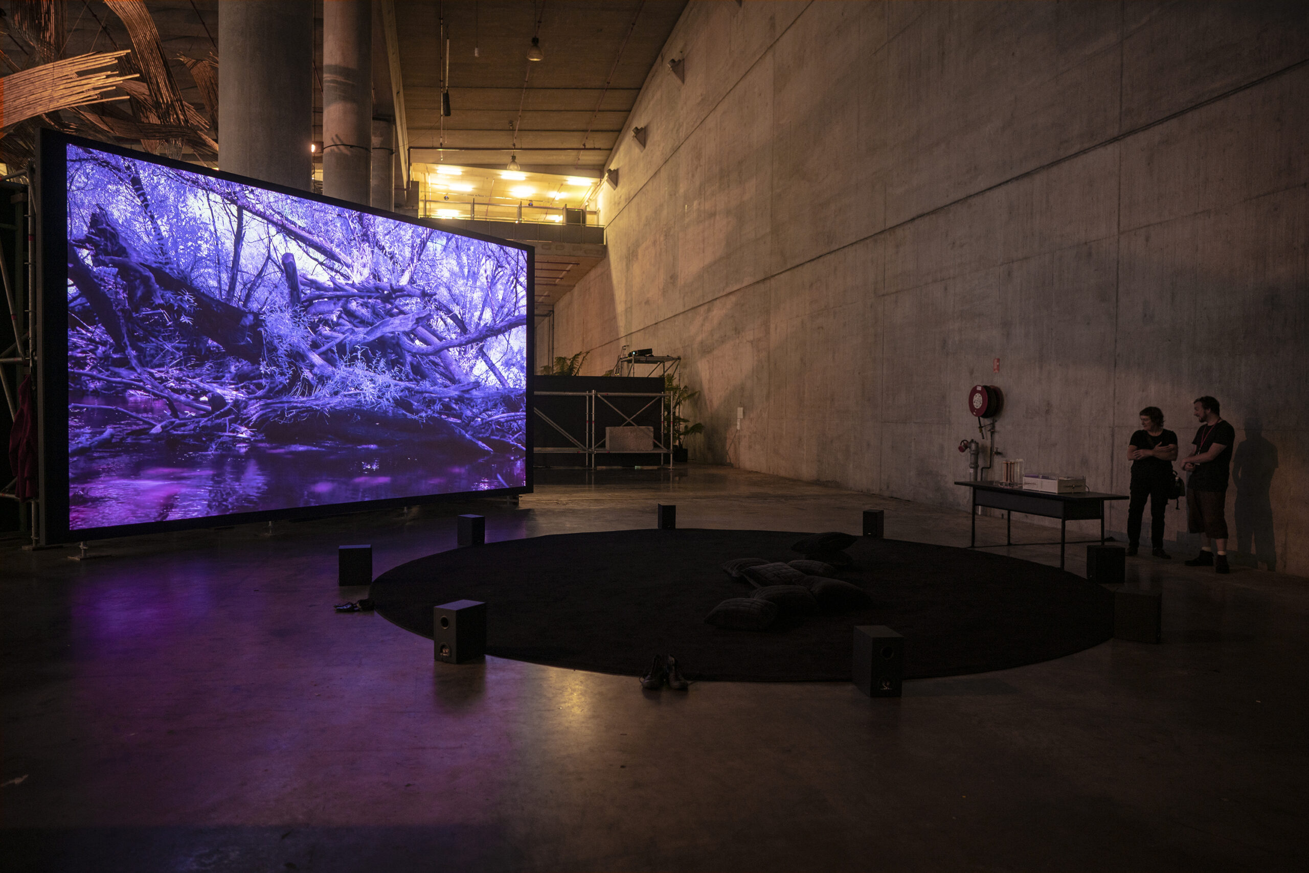 David Haines & Joyce Hinterding, Pink Steam, 2022, Installation View: 23rd Biennale of Sydney 2022, Video and sound installation: Single Channel Video shot in hyper colour infrared at 470 nm on a specially modified camera, Stereo Sound + 6 Channel live sound of Cosmic Rays (muons) – Cosmic Ray Detector: Geiger Muller Array, Muon Counter, various electronics, table, amplifiers. Dimensions variable: DUR 56:31. Photograph Haines Hinterding.