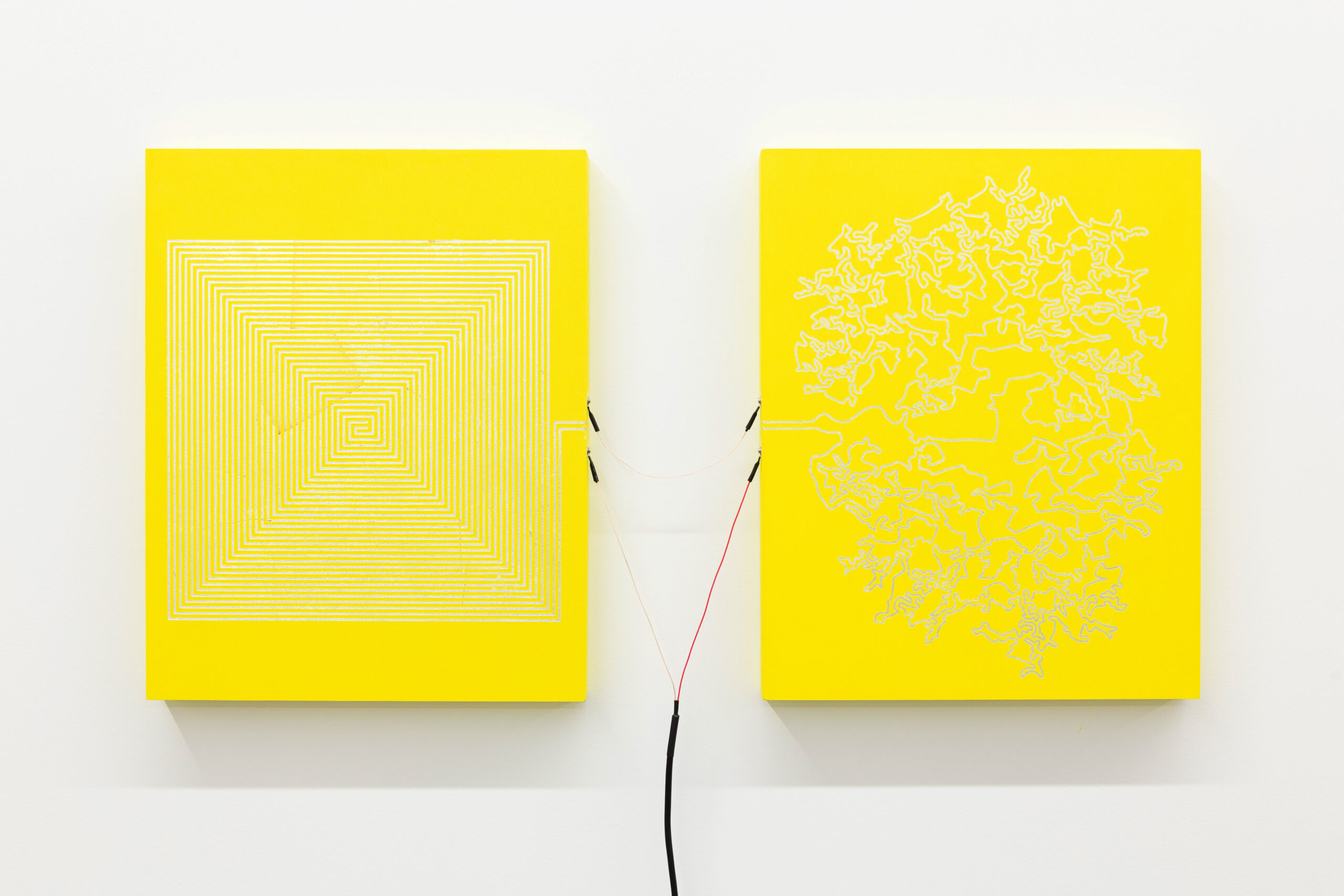 Floric Antenna 1 (Orange Lichen Study) & Floric Antenna 2 (Orange Lichen Study) (2018) are two “broadband energy scavenging, graphite loop antennae” that connect drawing, circuit diagrams, and natural growth patterns. They are derived from observations of Lichen, an organism that relies on a symbiotic relationship between fungi and algae. Lichen’s fungal substructure provides the physical support and derives its energy from decomposition, while the algae on the surface harness the electromagnetic energy from the sun to photosynthesise; together, they form a highly successful, optimised resonant energy-receiving structure. The translation from observed form to graphite loop antenna is where the medium of drawing connects to the technological world of circuit diagrams and the graphic language of electronics. The inherent conductivity of graphite allows a drawing of a loop antenna, based on space-filling curves derived from algorithmic analysis, to become energised by the surrounding electromagnetic environment.