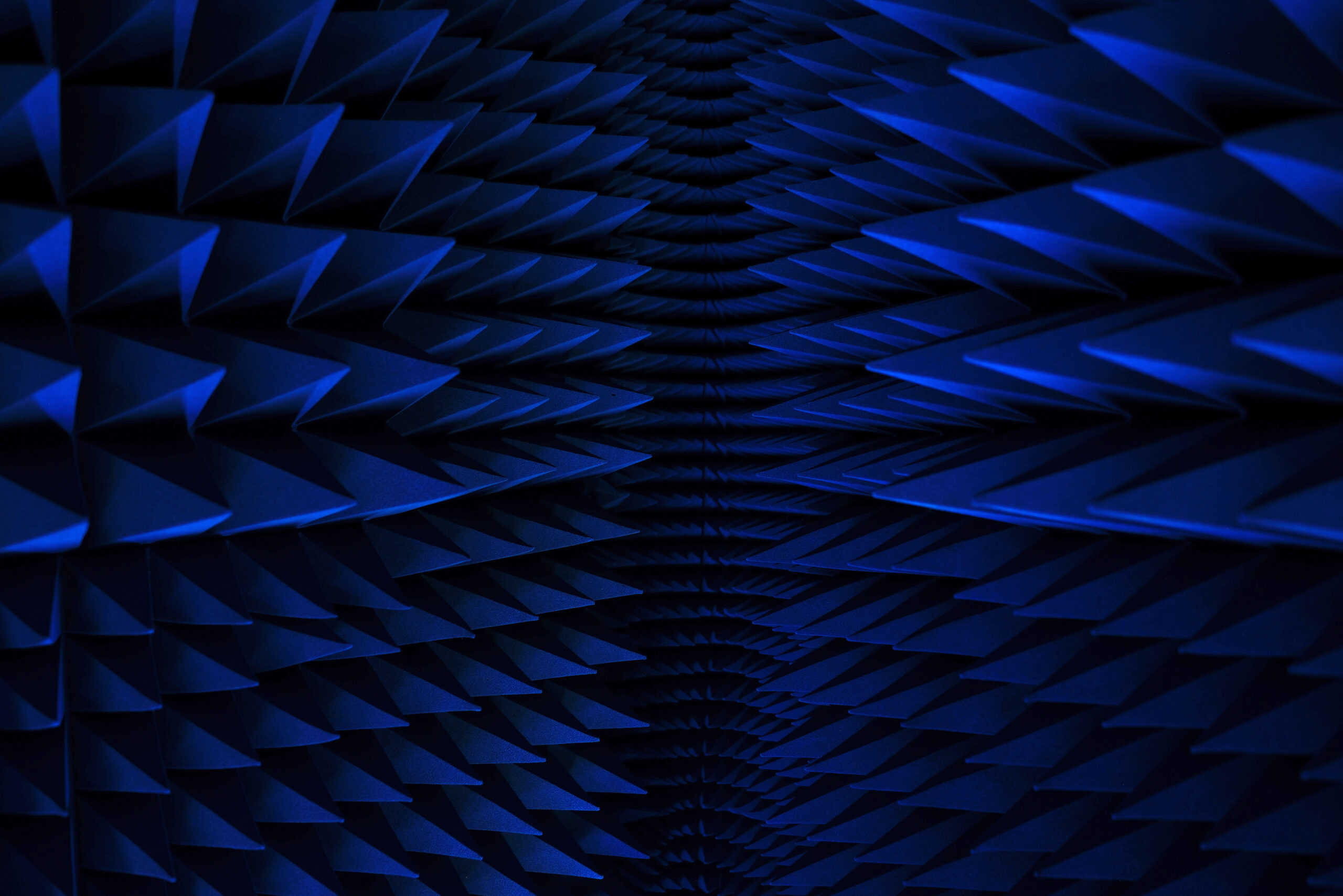 David Haines & Joyce Hinterding, Telepathy, 2008, Interior View 2024, Energy Fields: Vibrations of the Pacific Fulcrum Arts and Chapman University, California, USA. Custom anechoic acoustic tiles, acoustic blanket, plywood, timber frame, plasterboard, Air extraction unit. 6.0m x 4.8m x 4.8m x 2.4m. Photograph Haines Hinterding.