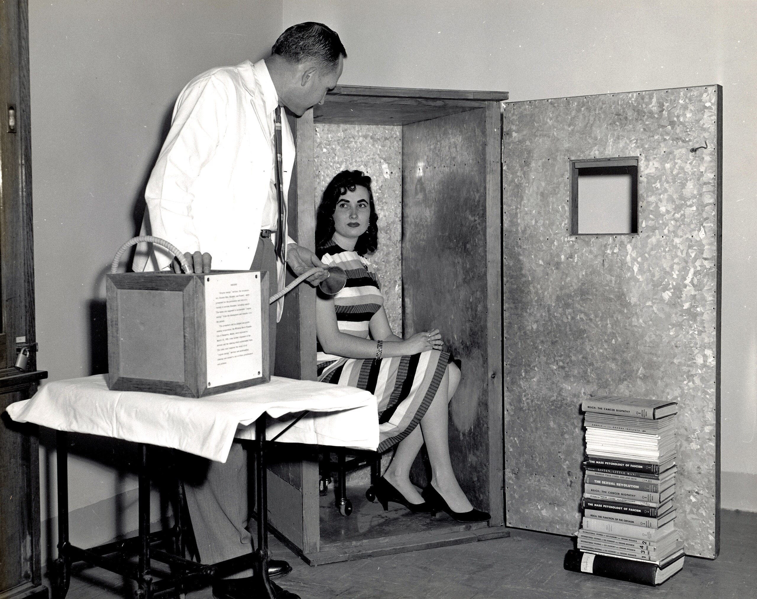Psychiatrist Wilhelm Reich declared the existence of a universal healing and revitalizing force, called orgone, and created devices (the booth and breathing apparatus are pictured here) to capture and administer it. Image public domain.