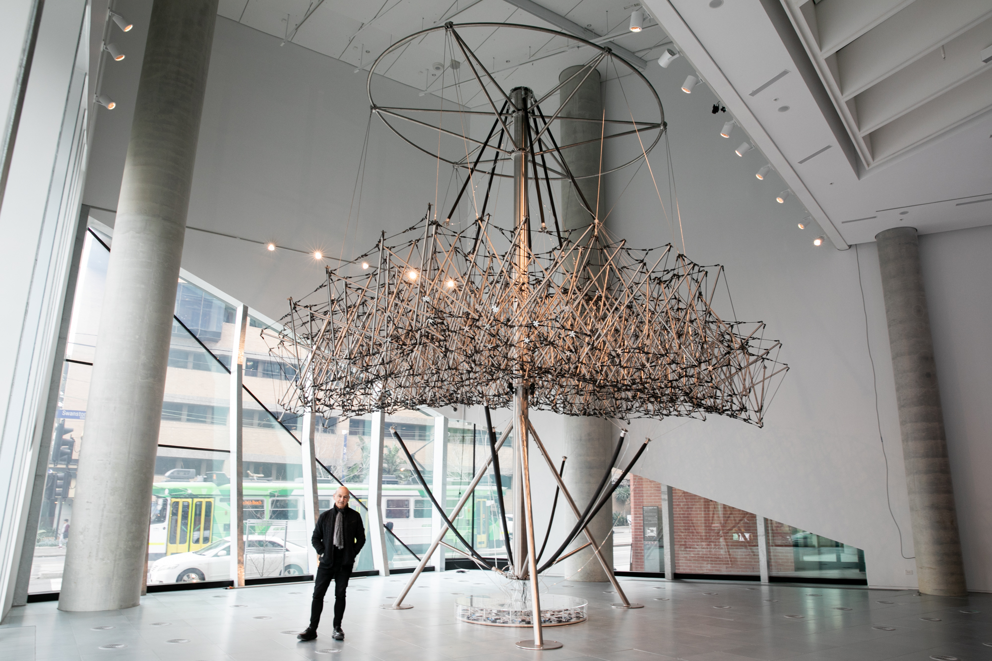 Stelarc with his work Anthropomorphic Machine at Science Gallery Melbourne. Photograph Alan Weedon.